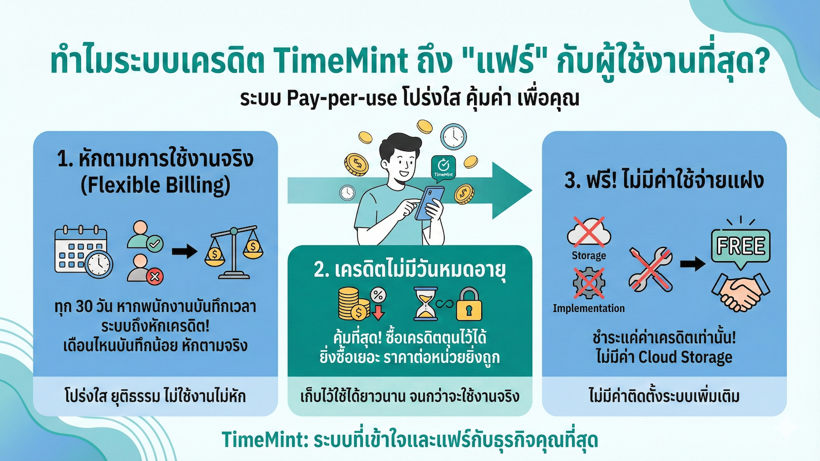 หักตามการใช้งานจริง (Flexible Billing): ในรอบทุกๆ 30 วัน หากพนักงานคนไหนมีการบันทึกเวลา ระบบถึงจะหักเครดิต เดือนไหนพนักงานบันทึกเวลาน้อย ก็หักตามจริง